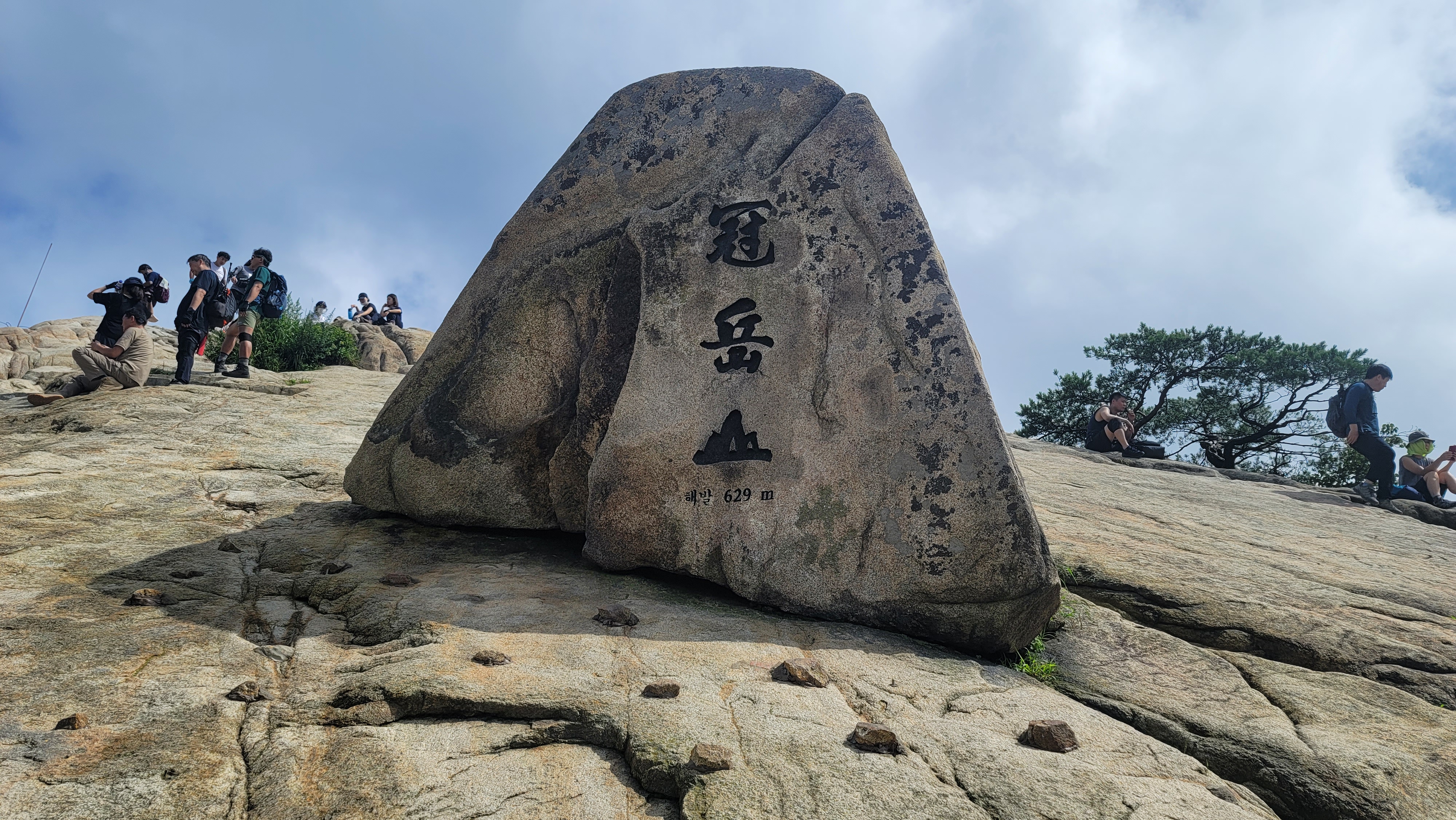 정상 부근에 다다르면 바위 능선을 따라 이동하게 되는데, 여기서부터 조망이 확 트이며 서울 시내와 한강이 한눈에 보입니다. **연주대 정상 (629m)**에서는 서울 전경과 관악구, 안양 방면까지 시원하게 조망이 가능합니다! 구름이 살짝 끼어서 바위에서 쉬는 사람들이 많습니다.