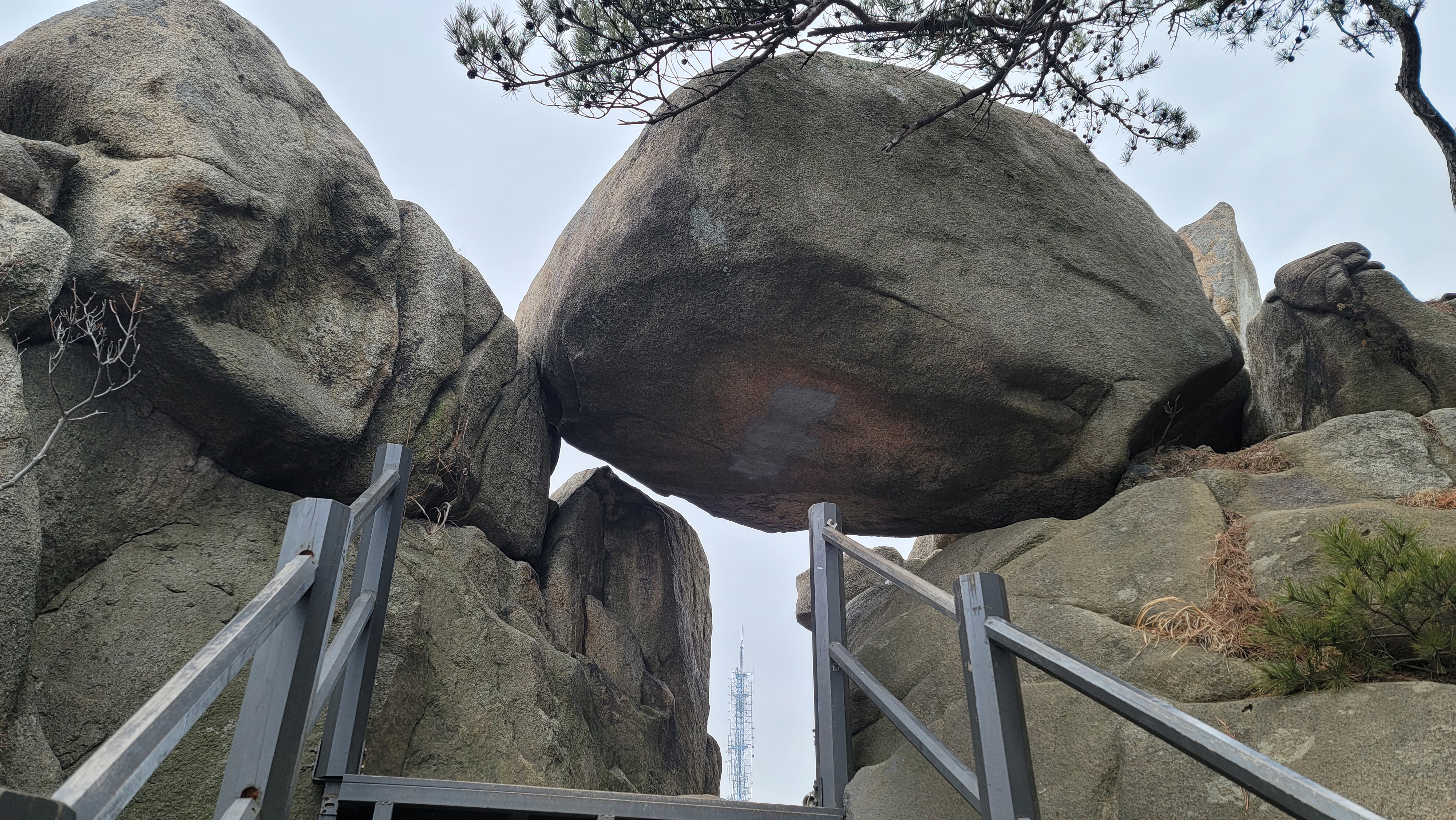 관악능선 명품 소나무숲길은 정말 걷기 편하고 상쾌합니다. 멀리 관악산 정상이 보입니다. 송신탑이 서있는 곳이 관악산 정상입니다. 아직 초보자라서 관악능선이 꽤나 길어 보입니다. 헬기장을 지나고 계단을 오르고 가파른 경사를 오르면 큰 바위가 나타납니다. 관악문입니다.