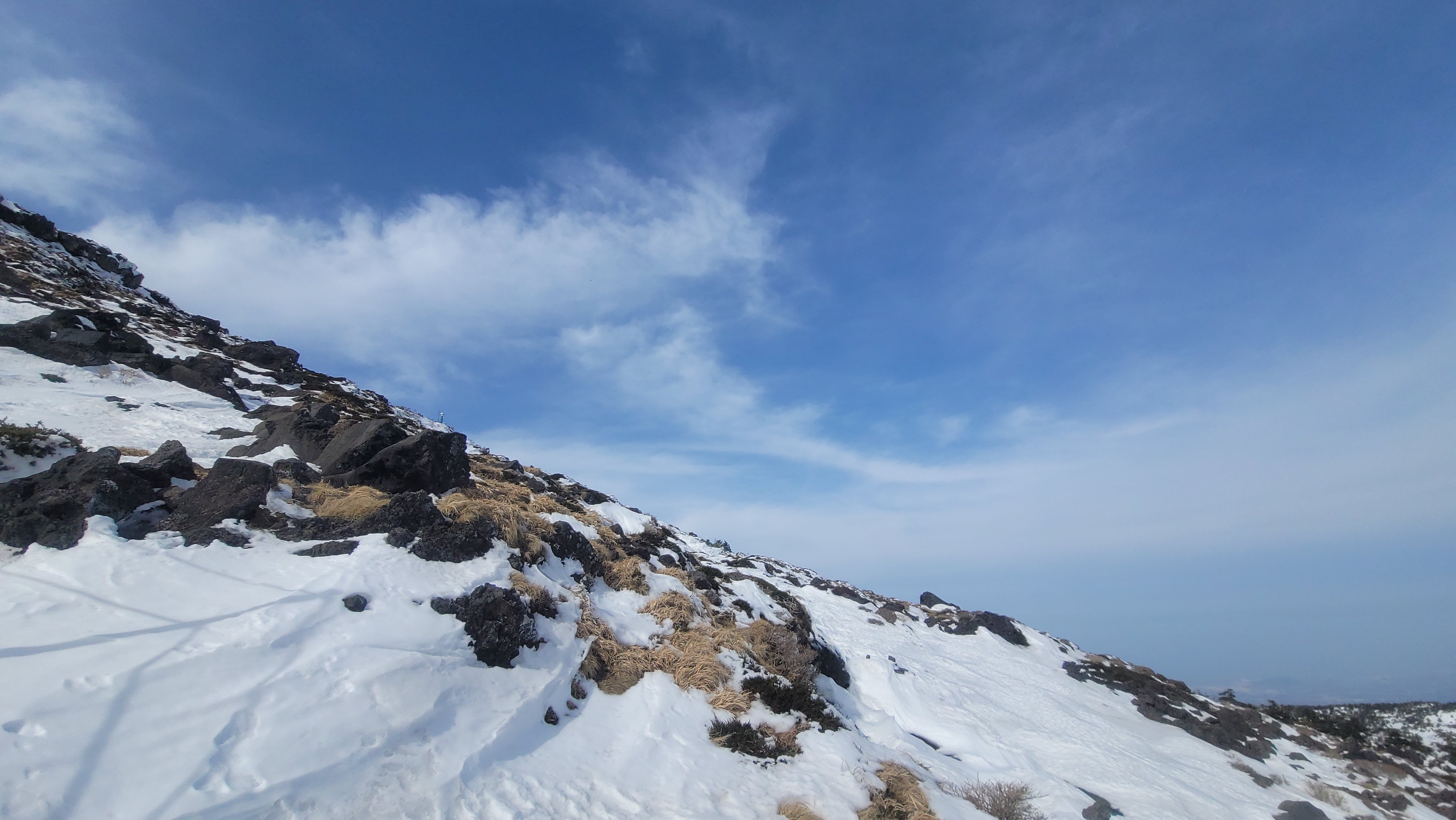 하산하는 길은 파란 하늘이 너무 이쁩니다. 눈 속에 발이 걸려서 넘어지기도 하고.. 하산길이 길기만 합니다.
