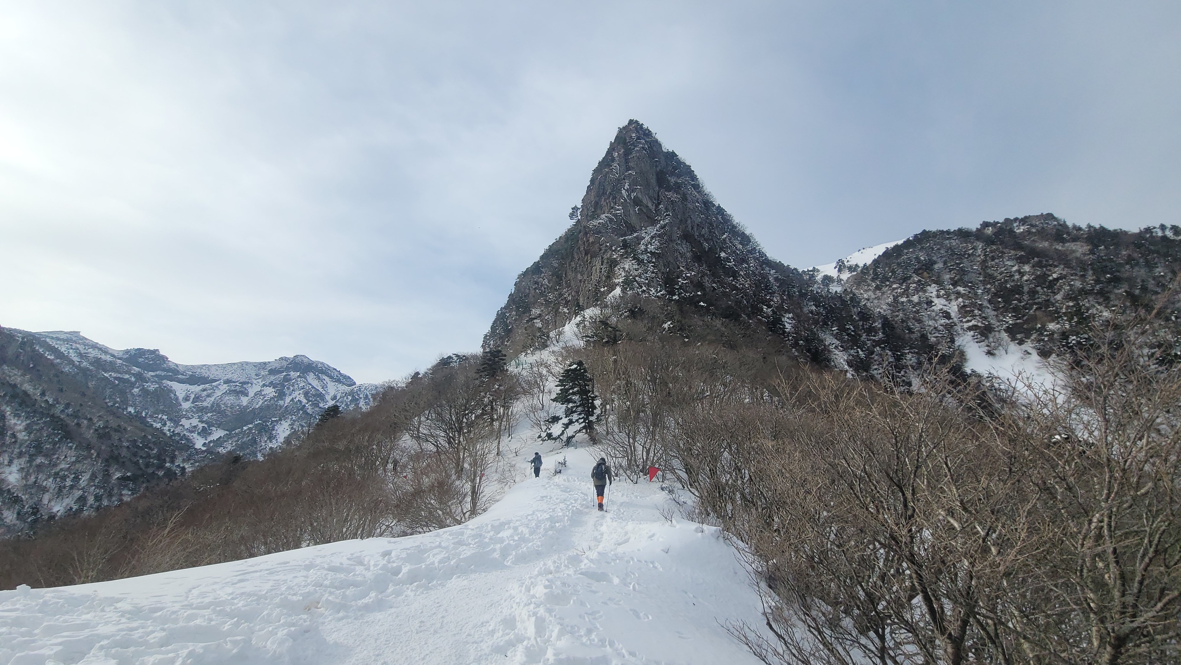 용진각대피소 터를 지나면 이제부터 제일 힘든 구간이 시작됩니다. 1.7km 정도 가파른 깔딱 고개 구간입니다. 이곳은 구상나무 숲으로 고사목이 장관을 이루고 있습니다. 한겨울이라서 눈 덮인 한라산이 수묵화처럼 아름답습니다.