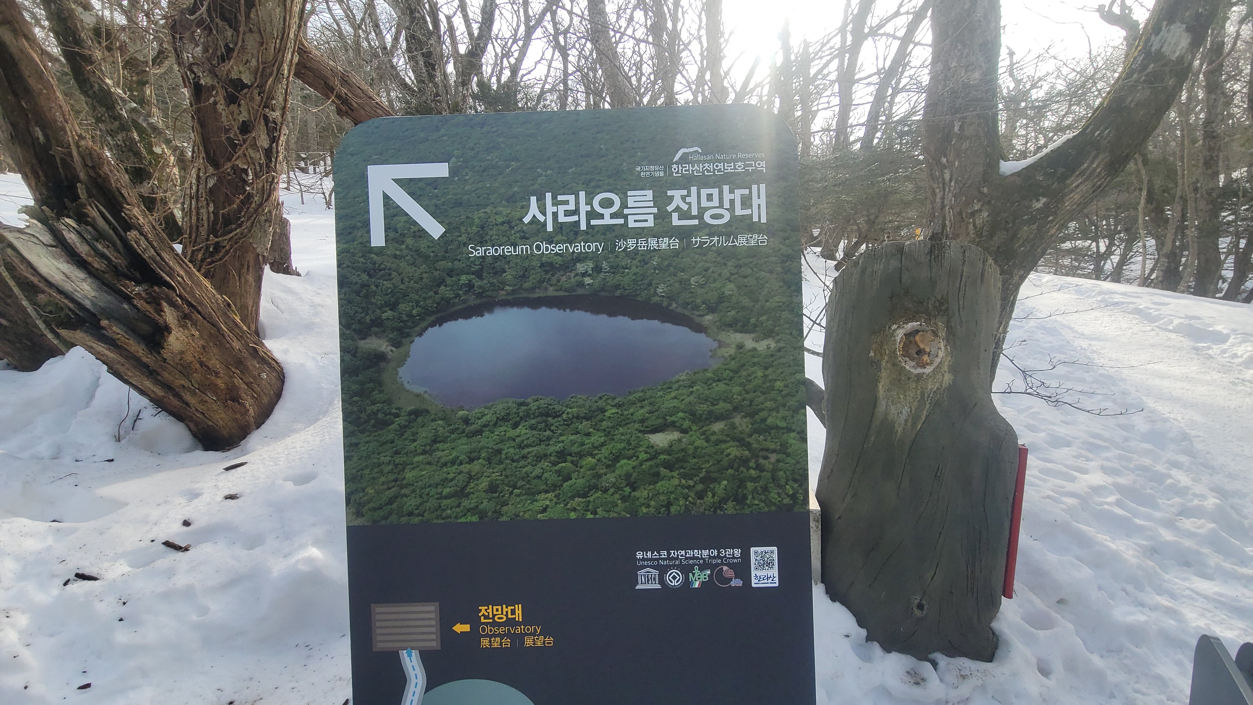 사라오름 전망대는 꼭 가봐야죠. 또 언제 올지 모르는데.. 사라오름 산정호수는 꽁꽁 얼어서 눈밭으로 변해 있습니다. 산정호수를 돌아 전망대로 올라갑니다.