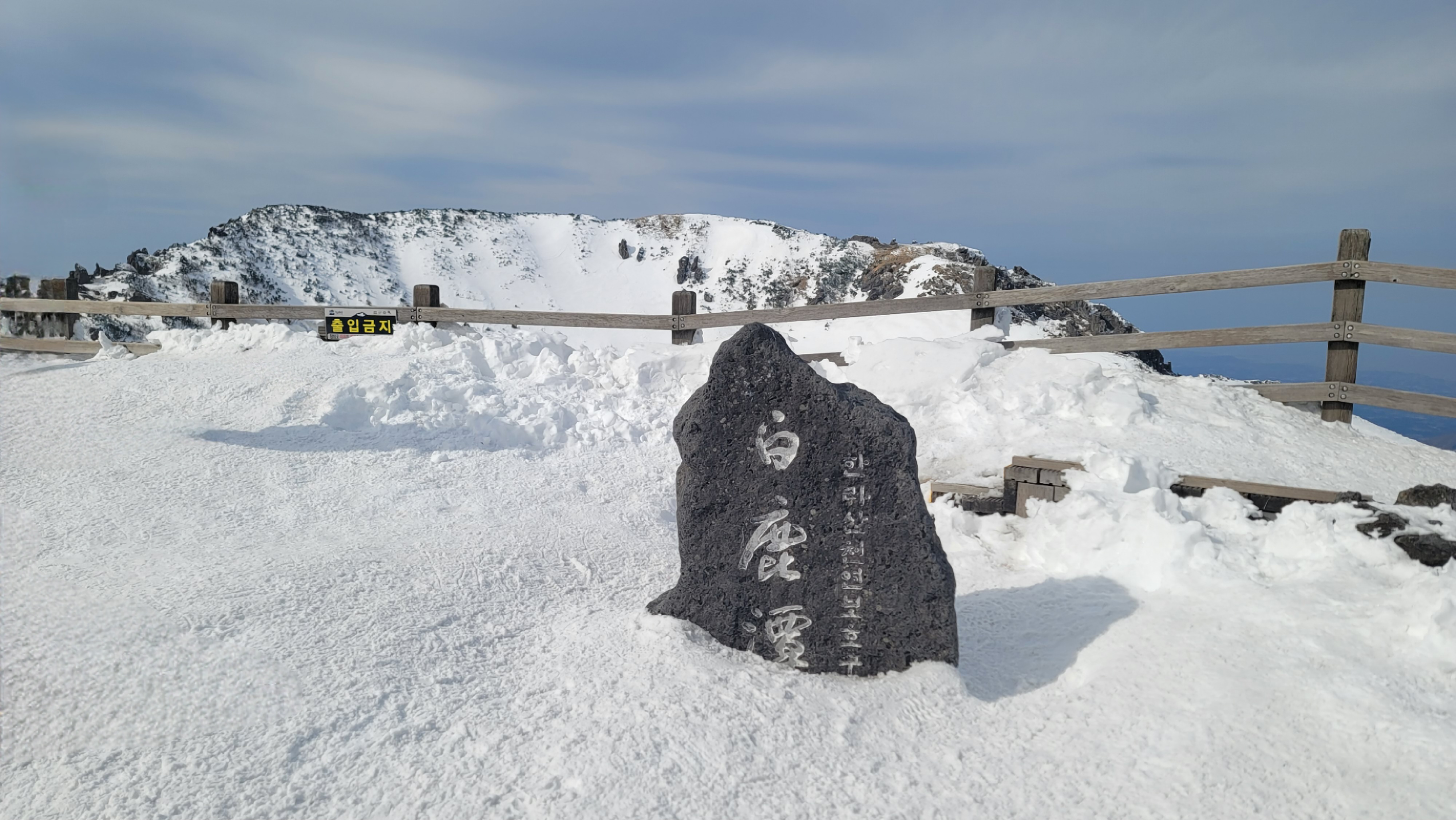 드디어 한라산 정상(동봉) 백록담에 도착합니다. 하얀 눈 덮인 백록담 풍경입니다. 대한민국 최고봉에 올랐다는 뿌듯함? 이 느껴집니다. 정상인증 줄이 길어서 정상석만 나오게 인증사진을 찍었습니다. 한 바퀴 돌고 난 후 사람이 바뀌는 틈을 타서 정상석 사진을 찍었습니다.