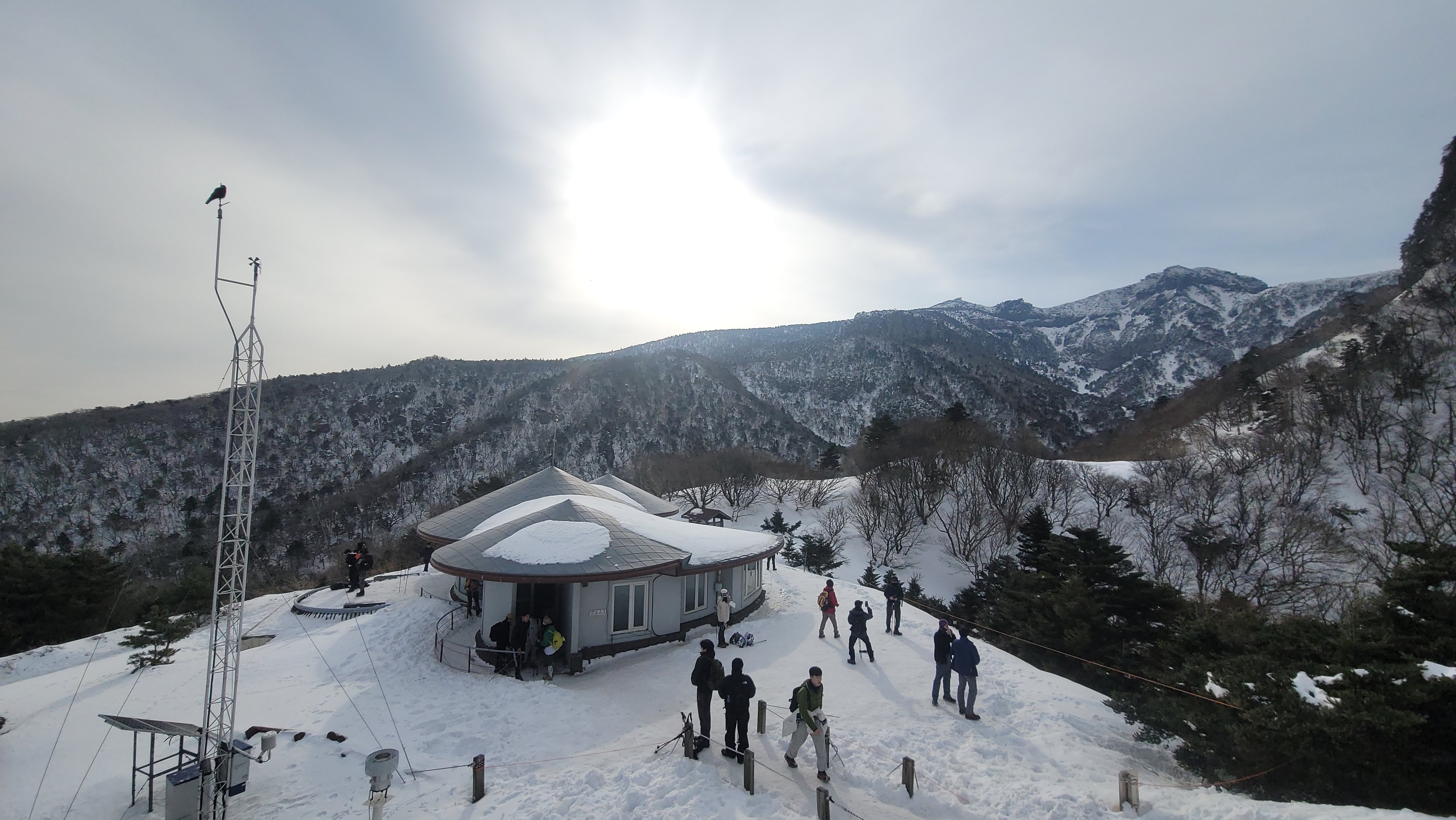 제가 잠시 쉬려고 이곳에 앉아서 간식을 먹고 있을 때 노란 담비 한 마리를 봤는데요. 카메라를 준비하는 사이 눈 속으로 사라졌습니다. 너무 귀여웠는데 한참을 기다려도 안 나옵니다. 결국 하산시간이 다가와 그냥 내려올 수밖에 없었습니다. 구름이 별로 없었는데 어느새 발아래는 운해가 깔려 있습니다. 13시 30분이면 하산해야 합니다.