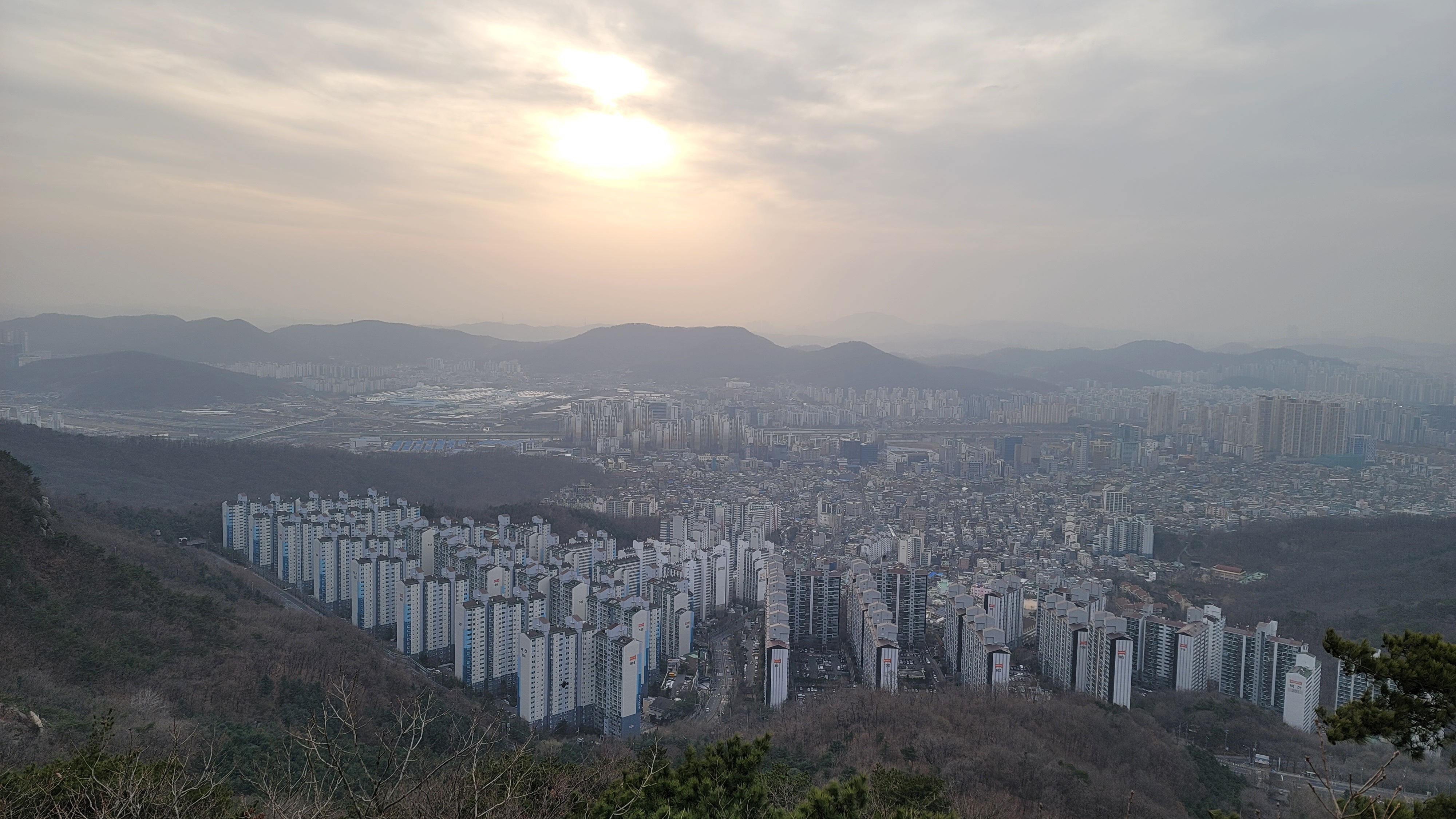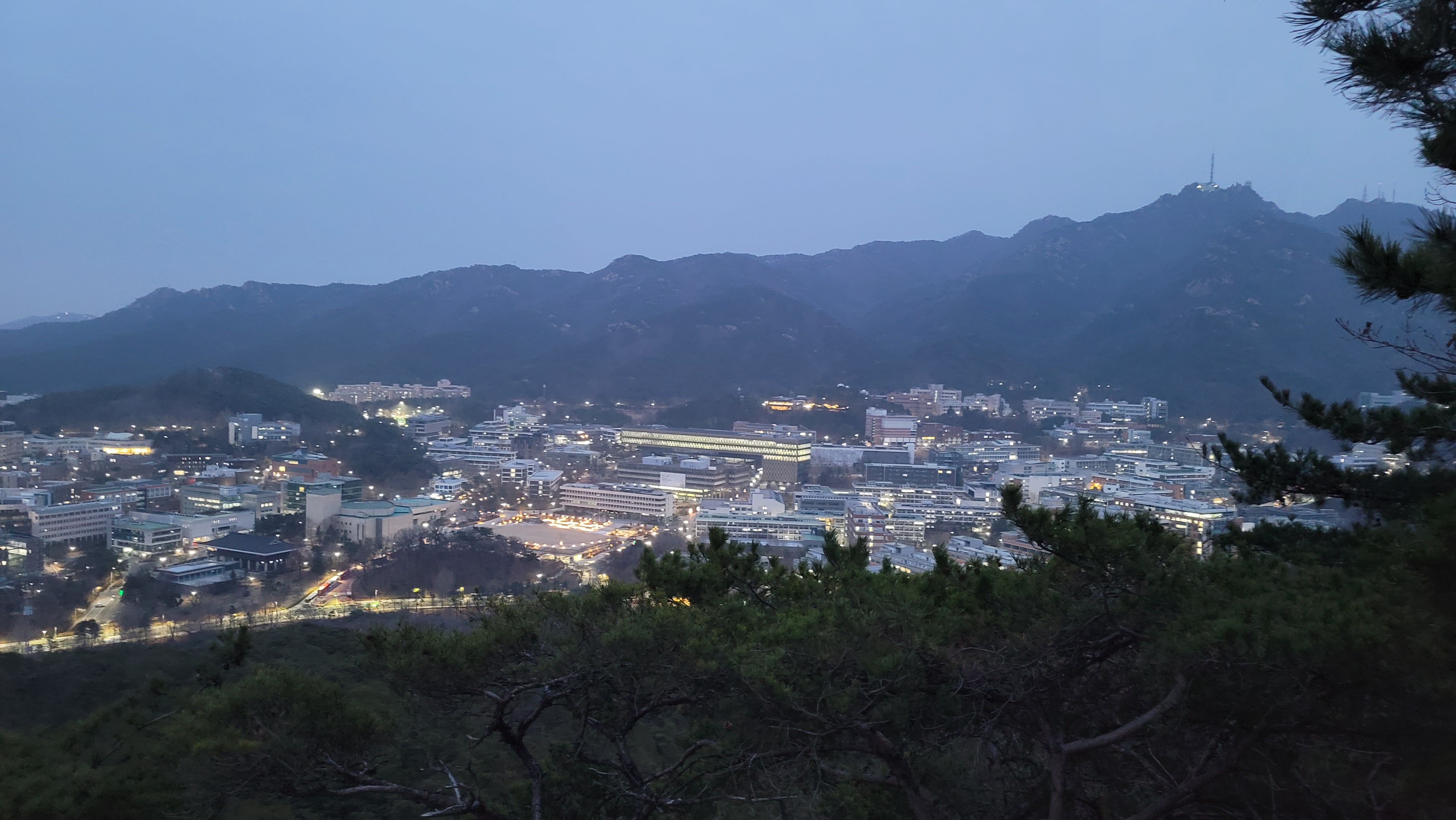 호암산 정상부는 거대한 바위덩어리입니다. 바라보는 일몰도 멋질 텐데 오늘은 구름 속에 가려서 흐릿합니다. 시간이 늦어 서둘러 하산을 시작합니다. 다시 민주동산을 지나고 장군봉에서 돌산방향으로 내려갑니다. 돌산국기대를 지나고 어두워져서 서울대 야경이 멋지게 보입니다. 멀리 관악산 정상도 보이네요.