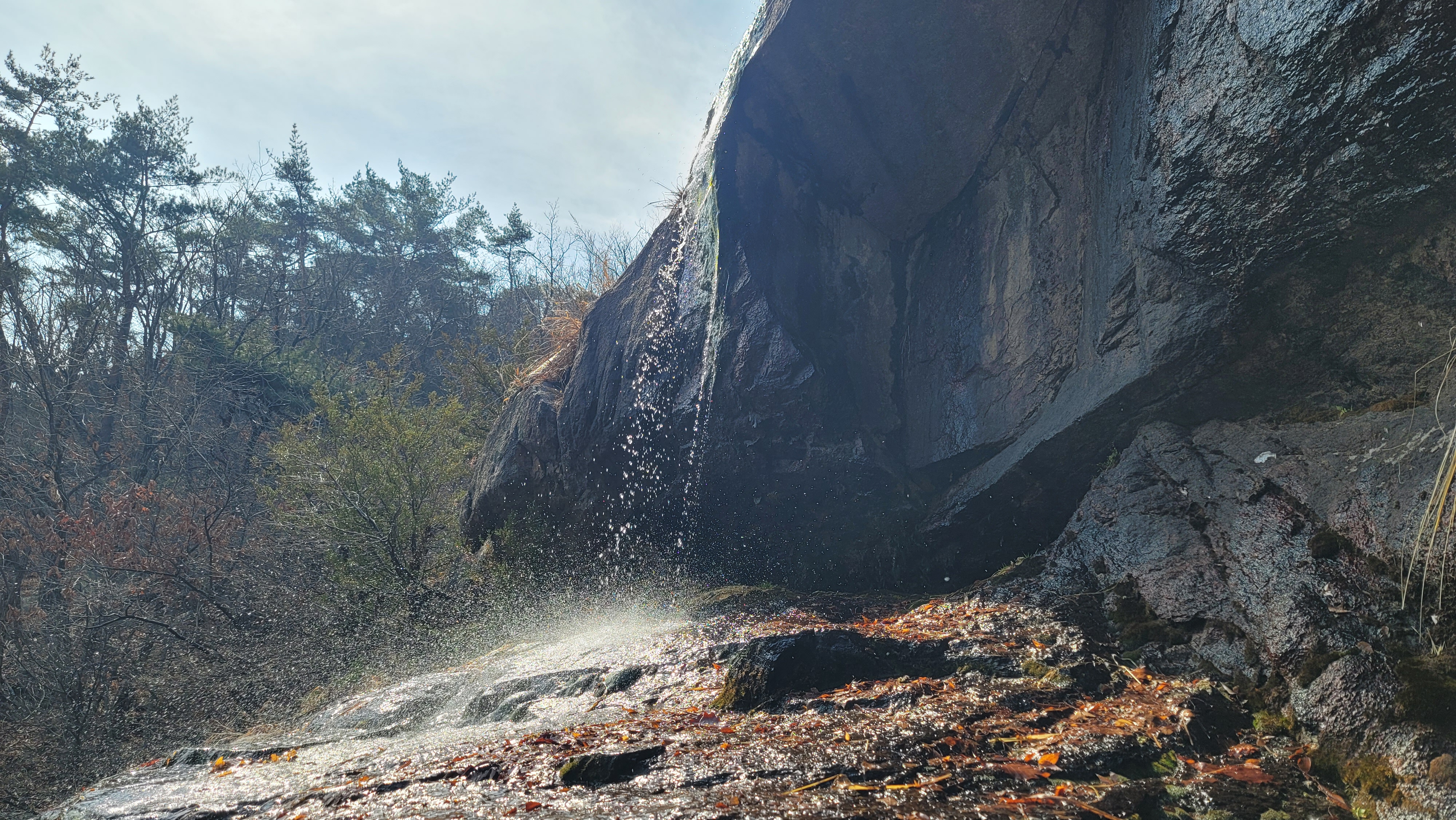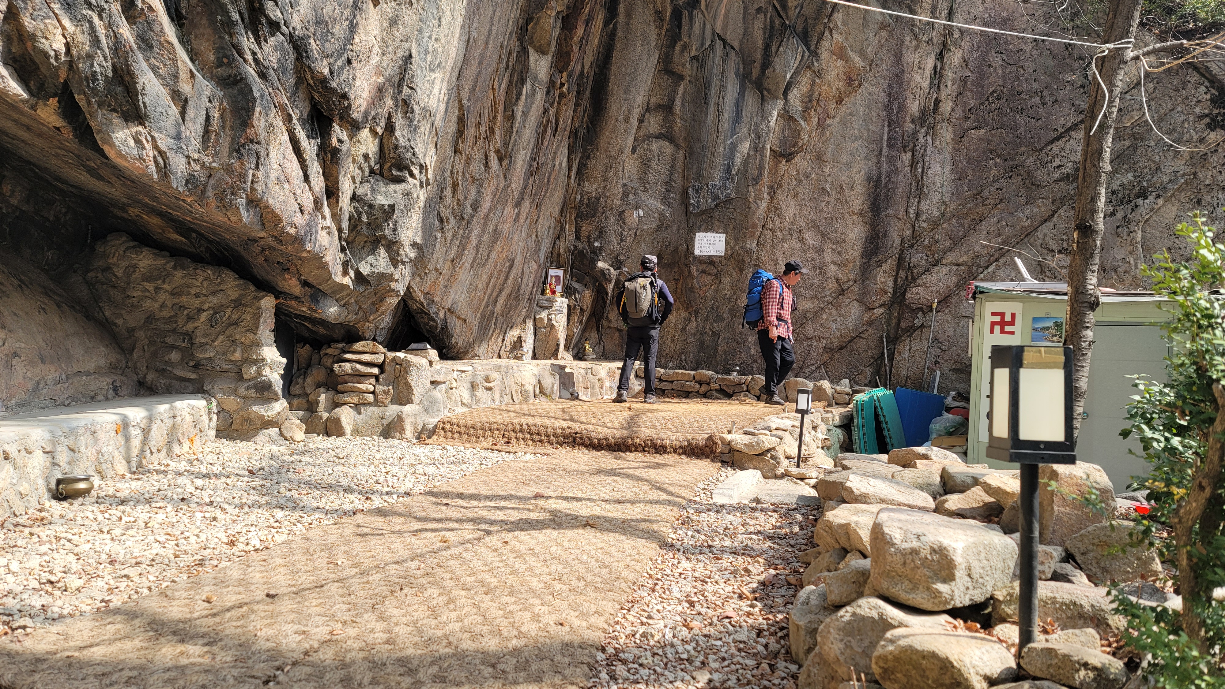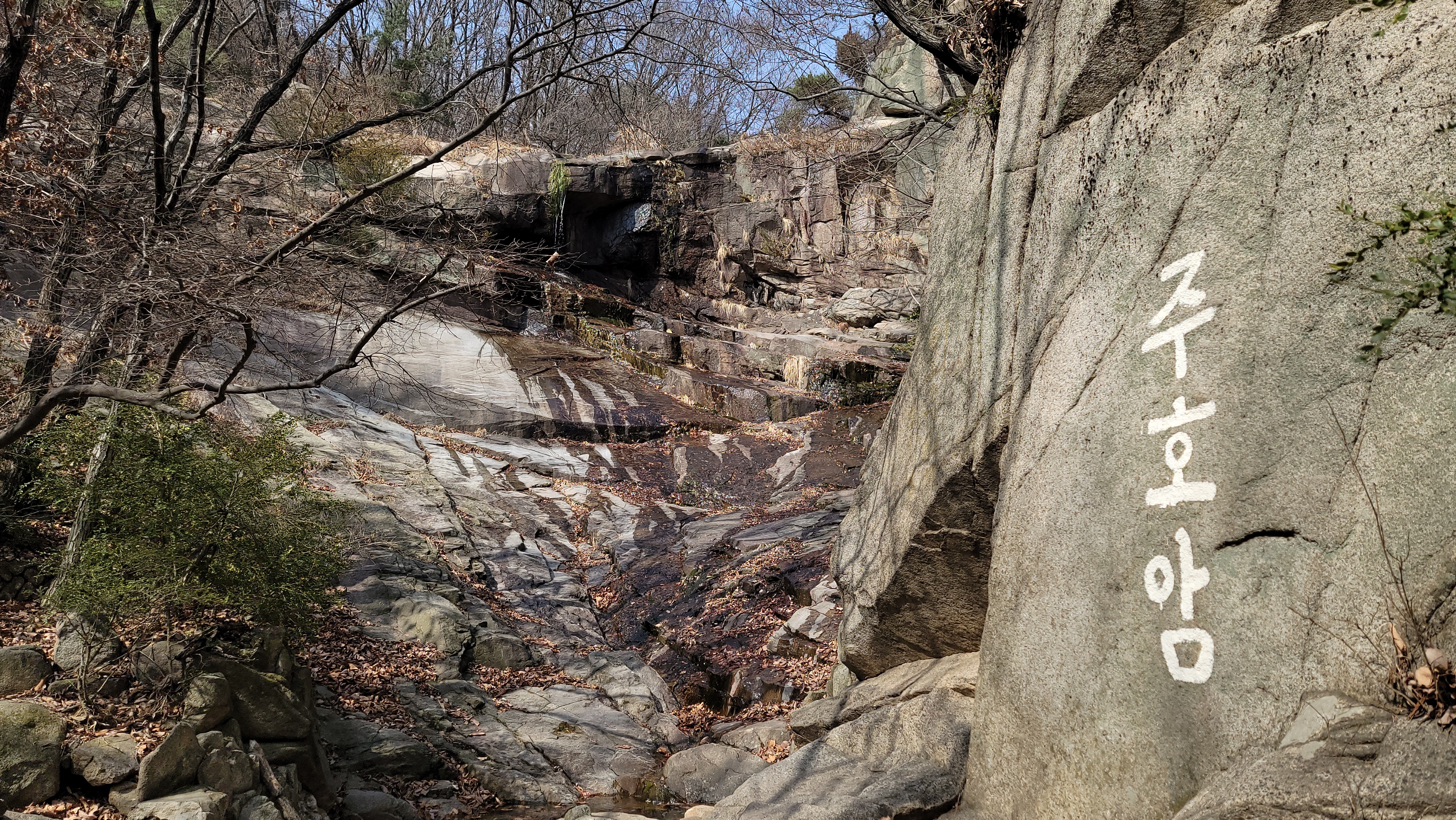 계곡을 따라 문원폭포까지 올라왔습니다. 폭포 바로 옆에 조그만 조립식 패널로 지어진 암자가 있습니다. 수량이 적어 조금씩 떨어지는 폭포가 햇살에 빛이 납니다.