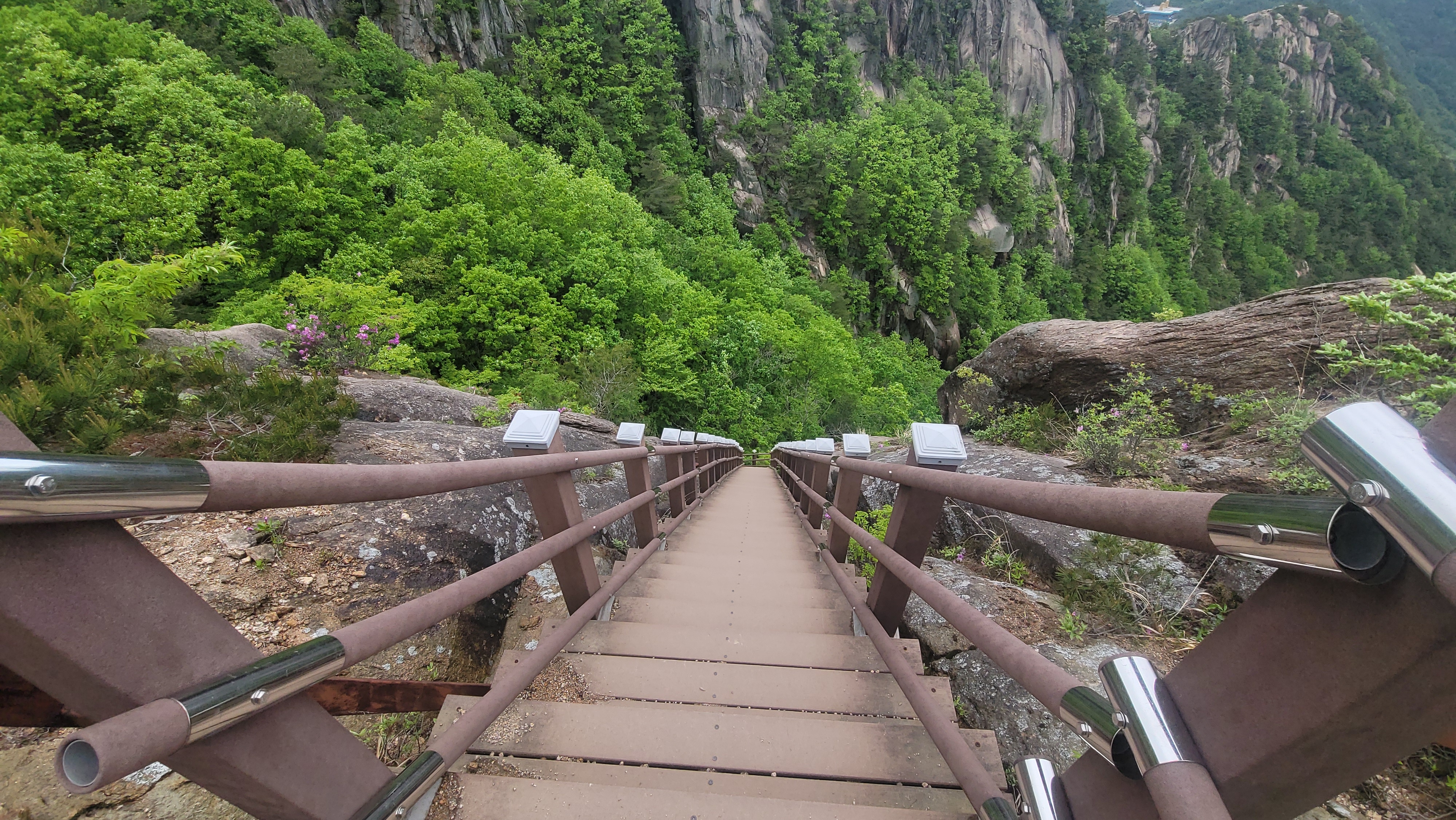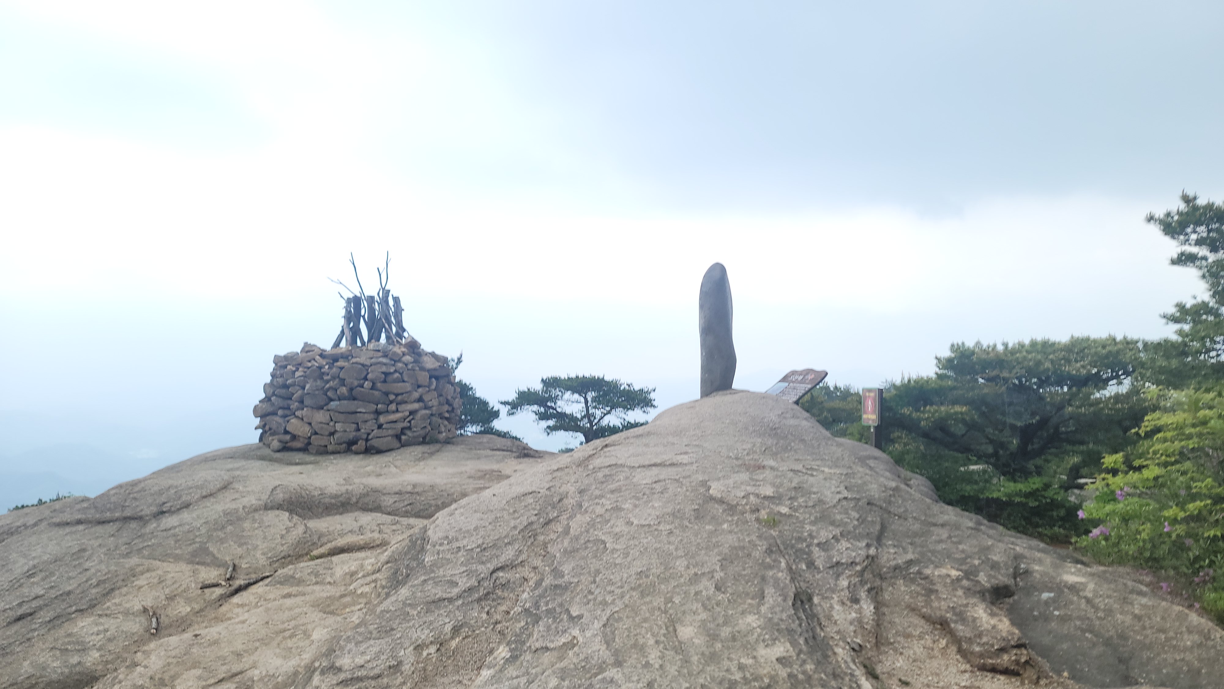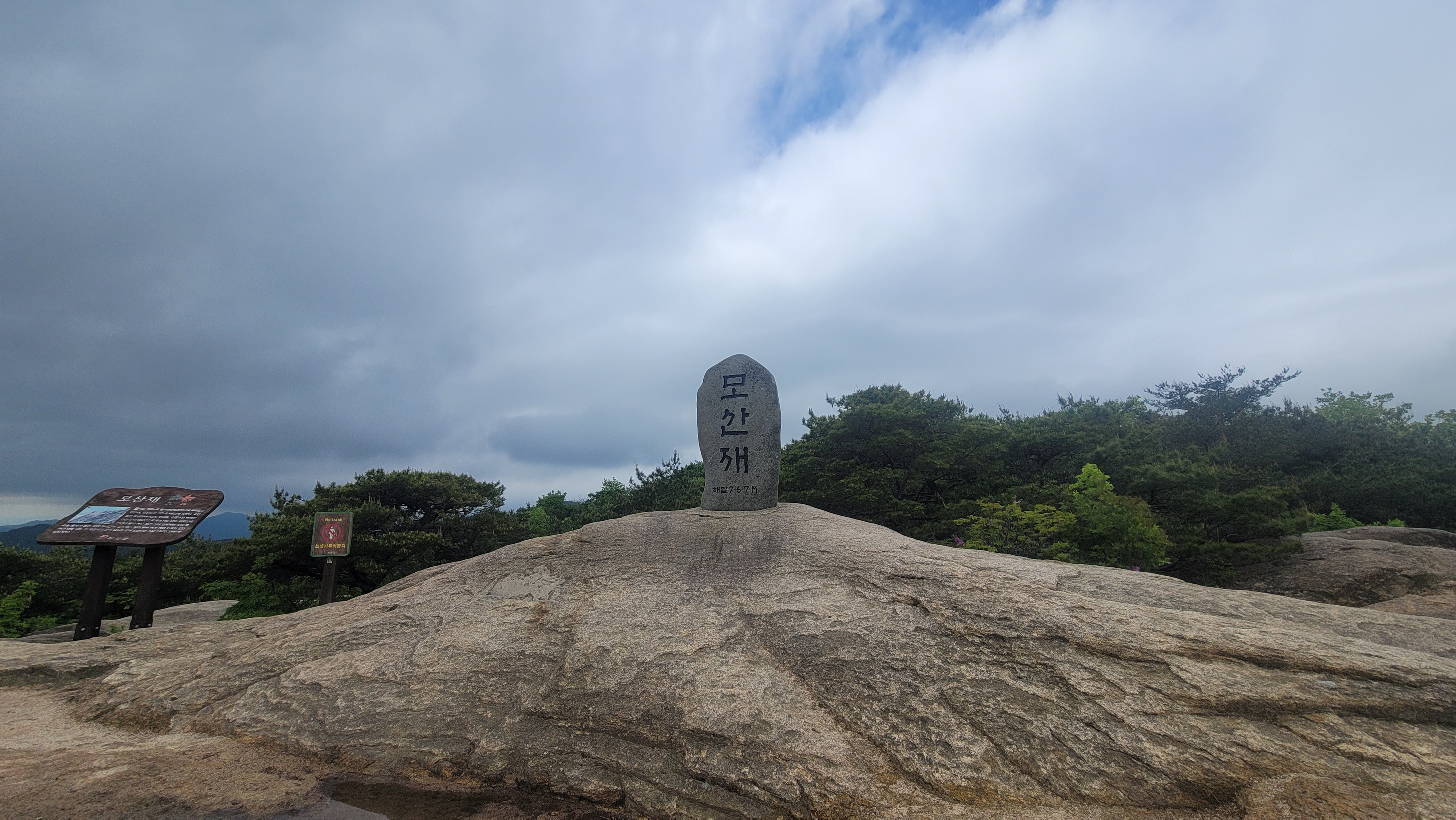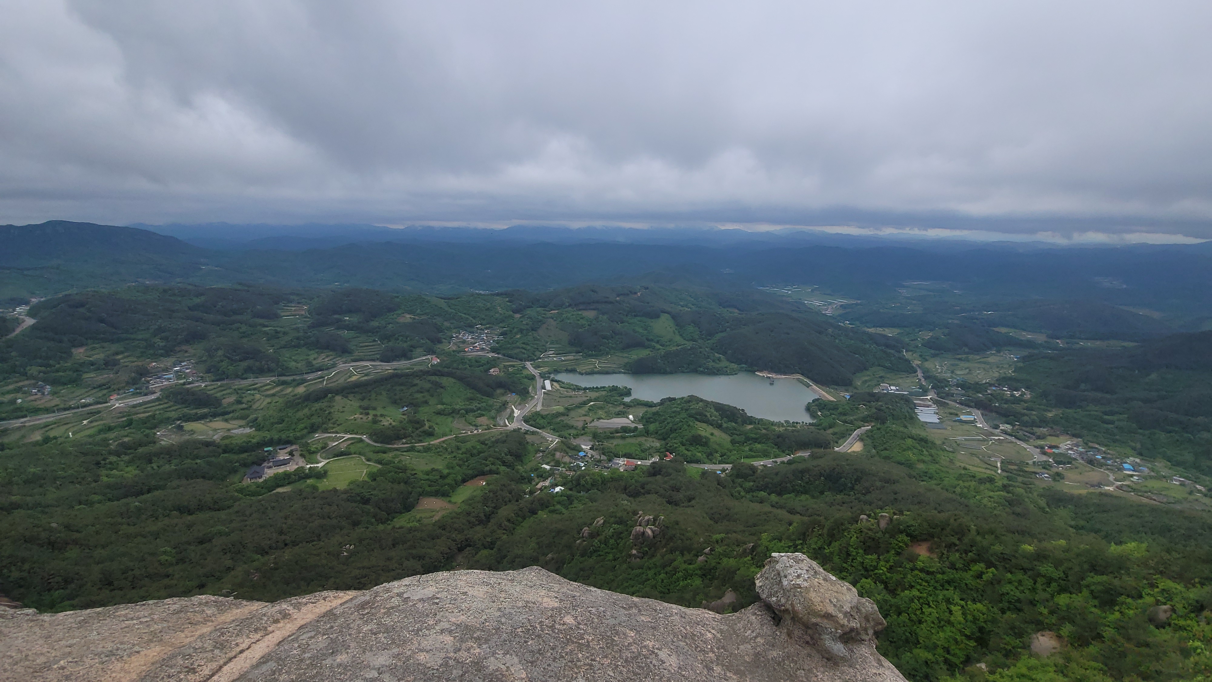 모산재기적길은 가파른 암릉길입니다. 가파른 목계단을 오르면 바로 앞에 돛대를 닮은 돛대바위가 서있습니다. 돛대바위에서 모산재주차장과 대기저수지가 코앞에 보입니다. 날씨는 금방이라도 비가 쏟아질 듯 구름이 많이 끼어있습니다.